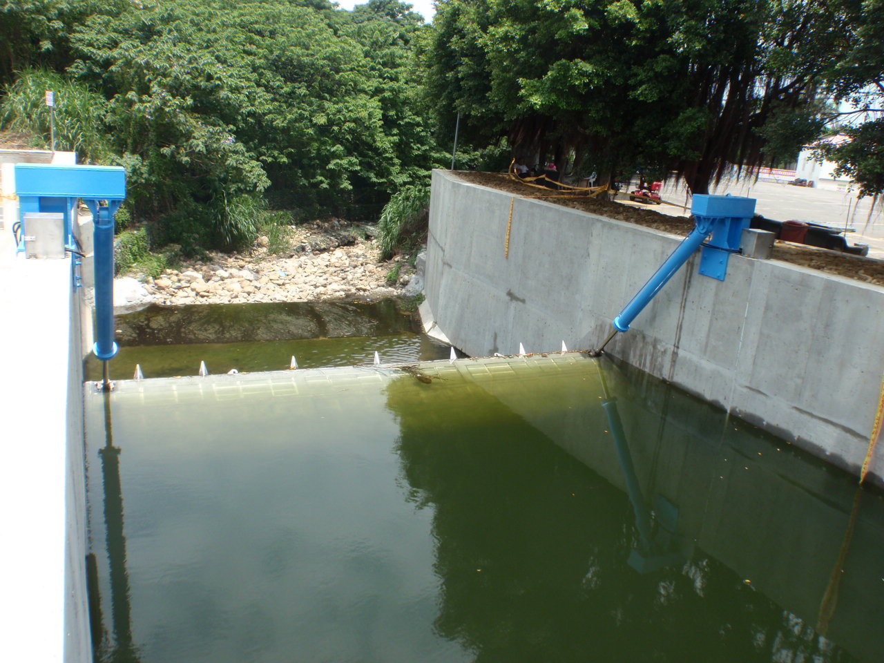 Most of the irrigation water for this area comes from Shimen Reservoir, with the rest from rainfall and river return flow, making river water a crucial resource. Fixed weirs often cause drainage difficulties due to raised water levels. To effectively solve flooding problems and address the challenges posed by climate change-induced storms, an electrically operated automatic tilting weir was installed after reviewing advanced river management methods from other countries, replacing the traditional fixed weir.