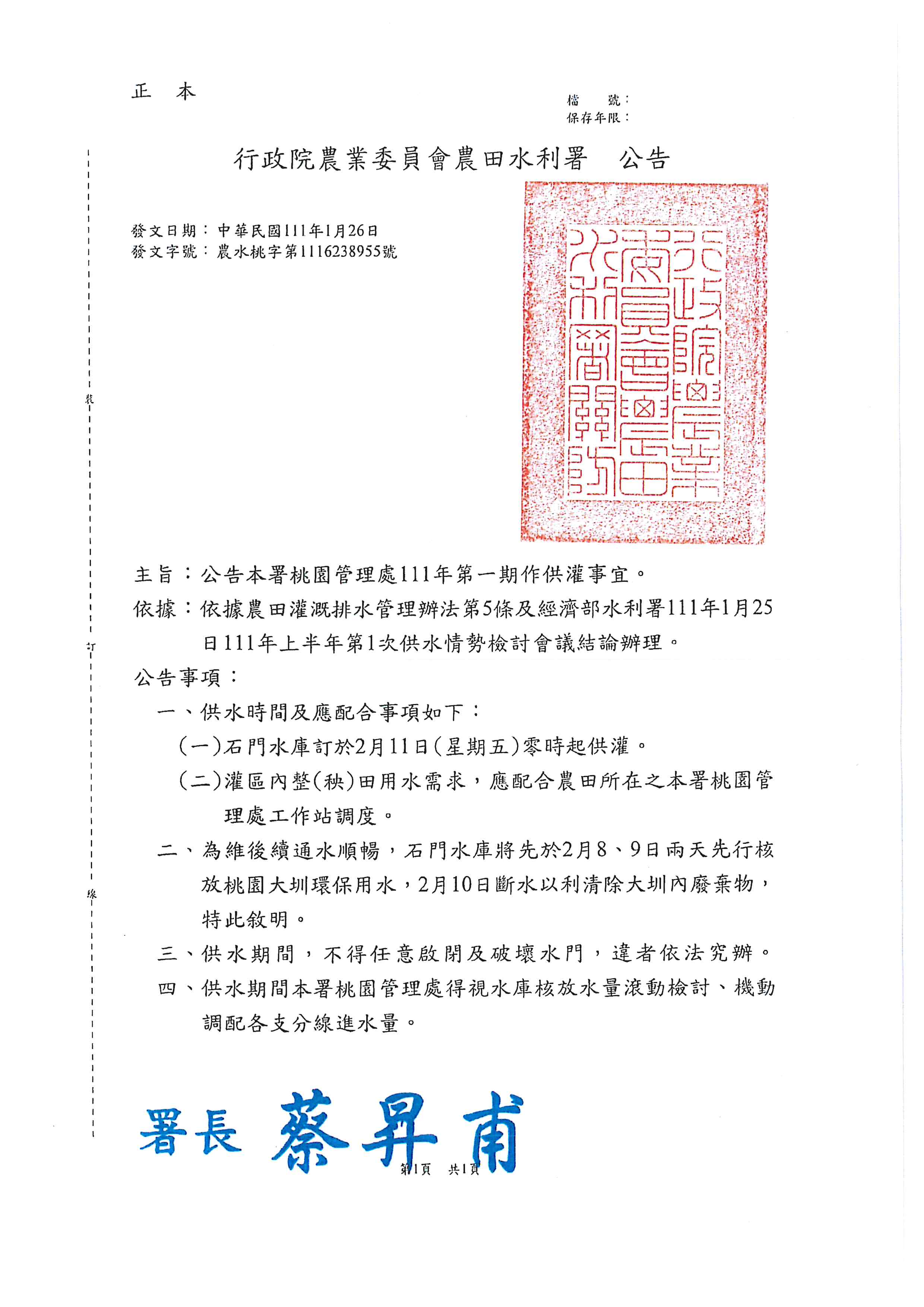 依據農田灌溉排水管理辦法第5條及經濟部水利署111年1月25日111年上半年第1次供水情勢檢討會議結論辦理