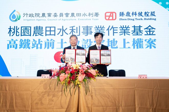 原農田水利會於109年10月1日改制納入行政院農業委員會農田水利署,其資產納入農田水利事業作業基金管理,除以原有活化收益方式籌措農田水利事業經費外,農田水利署持續以多元方式活化資產,今(5)日舉辦簽約典禮,桃園市長及印刷電路板相關供應鏈廠商約百餘人出席。農田水利署與臻鼎科技股份有限公司簽訂設定地上權之契約,本案地上權存續期間為70年,預計權利金及租金可達新臺幣15億元以上,所得收益均將回饋滾存於農田水利事業作業基金,以達農田水利事業永續經營之目的。