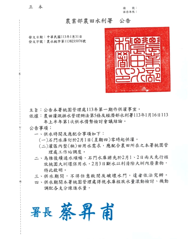 桃園大圳供水時間及應配合事項如下: 1.石門水庫訂於2月1日(星期四)零時起供灌。 2.灌區內整(秧)田用水需求,應配合農田所在之本署桃園管理處工作站調度。 3.為維後續通水順暢,石門水庫將先於2月1、2日兩天先行核放桃園大圳環保用水,2月3日斷水以利清除大圳內廢棄物,特此敘明。 4.供水期間,不得任意啟閉及破壞水門,違者依法究辦。 5.供水期間本署桃園管理處得視水庫核放水量滾動檢討、機動調配各支分線進水量。